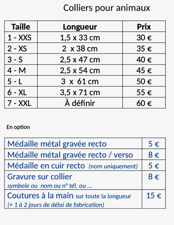 Chaque collier est confectionné à la main selon les mesures exactes de votre chien, pour un confort optimal et un maintien sécurisé au quotidien.